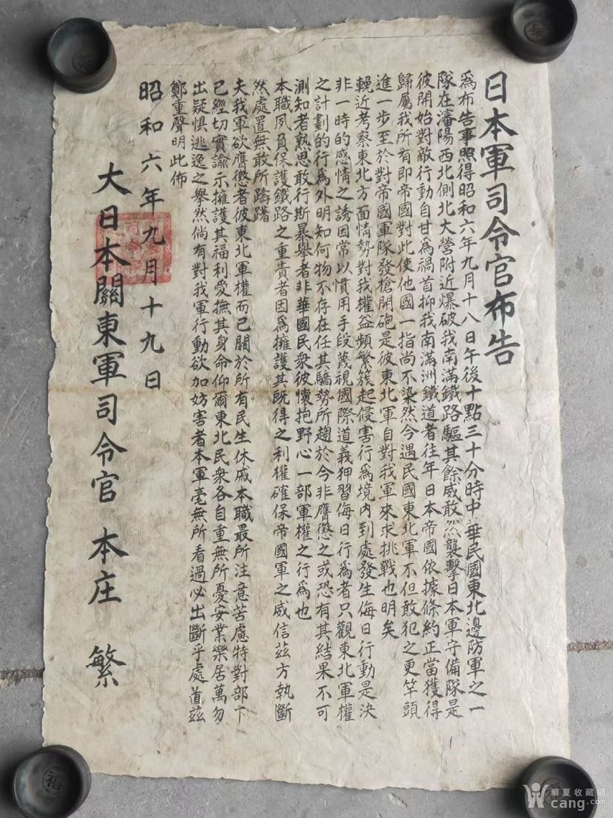 地摊>寻宝区>其它>昭和六年,日本关东军司令官,本庄。发佈的老布告一张。字迹清晰> 收藏分享 举报昭和六年,日本关东军司令官,本庄。发佈的老布告一张。字迹清晰编号:SD186115 更新时间:2025.04.29包邮¥0一口价 浏览5送去鉴定 运费:包邮立即购买不支持七天无理由退货安全支付消费保障店主推荐非卖品/勿拍包邮¥10000000 36包老,特价包邮¥0 23和田黄玉南瓜雕件包邮¥0 17手绘胭脂壶,全品完整包邮¥0 38和田黄玉灵芝纹牌、包邮¥0 14和田黄玉龙纹斧包邮¥0 16永乐。。。。包邮¥0 34顺治五彩花菇包邮¥0 33和田黄玉诗文环包邮¥0 16老坑玉壁 望子成龙包邮¥0 20藏品描述藏品展示服务保障 手机购买 安全提示为保障您的利益,请在平台下完成交易。切勿私自微信、支付宝、银行转账,谨防诈骗!平台外产生的交易纠纷,将不受平台资金保护。藏品描述昭和六年,日本关东军司令官,本庄。发佈的老布告一张。字迹清晰藏品展示服务保障消费者保障服务该卖家已缴纳消保保证金,您可放心购买。支付方式支付宝安全支付安全支付余额支付网银支付
