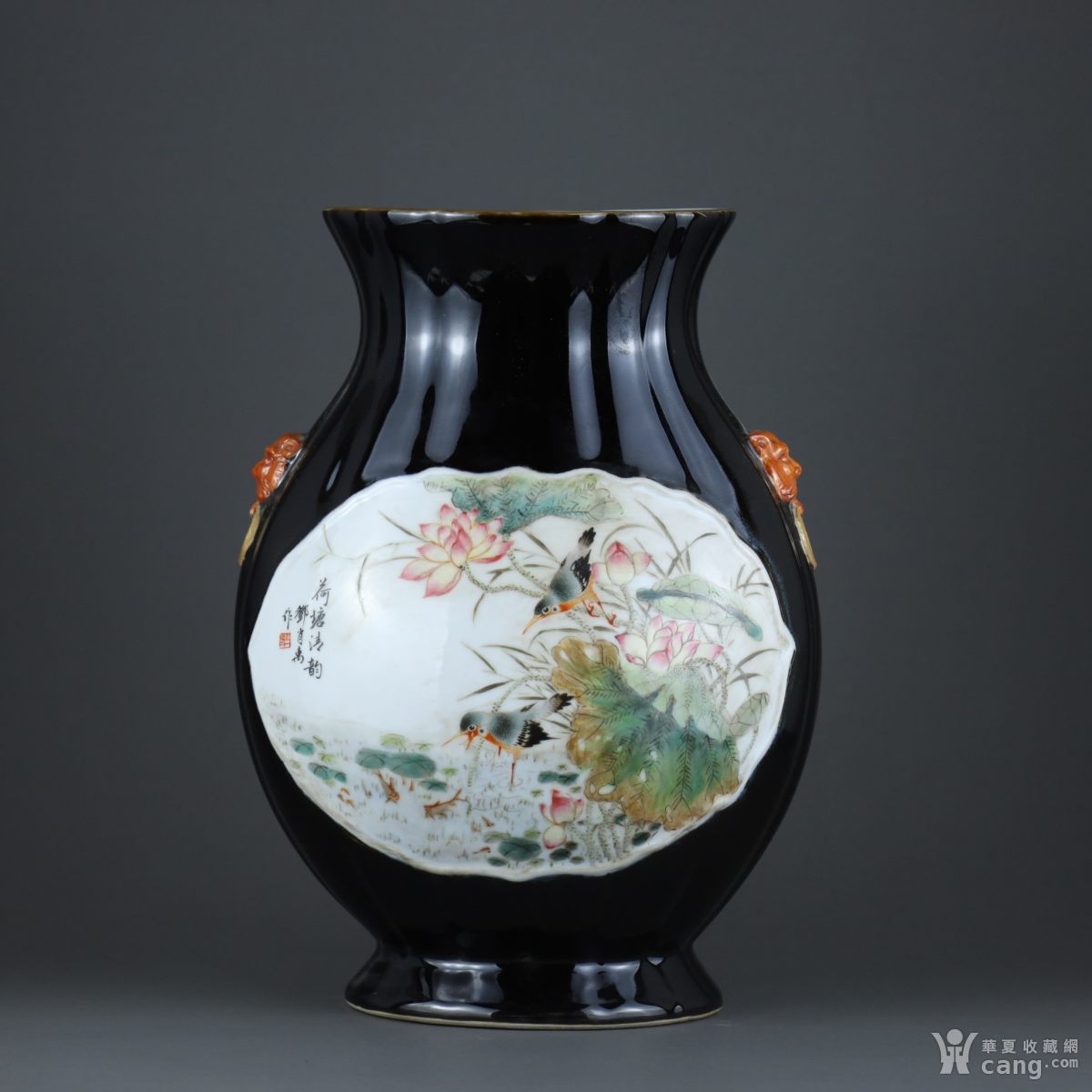 民国 邓肖禹霁蓝釉开窗粉彩花鸟纹瓜棱兽耳尊
