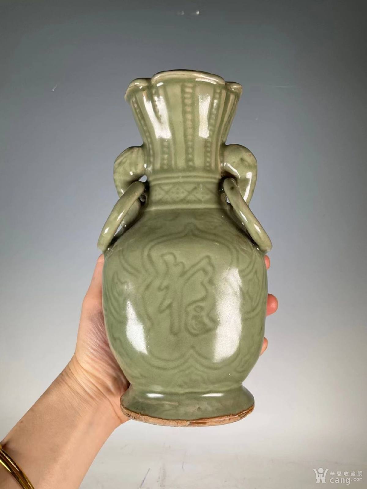 回流高古豆青釉雕瓷福寿双环象耳瓶