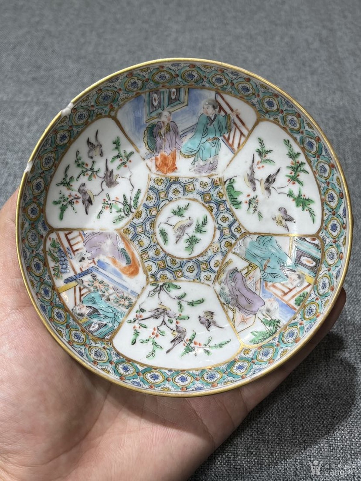 清代咸丰时期金彩开窗「人物花鸟故事」赏盘/杯托/壶承
