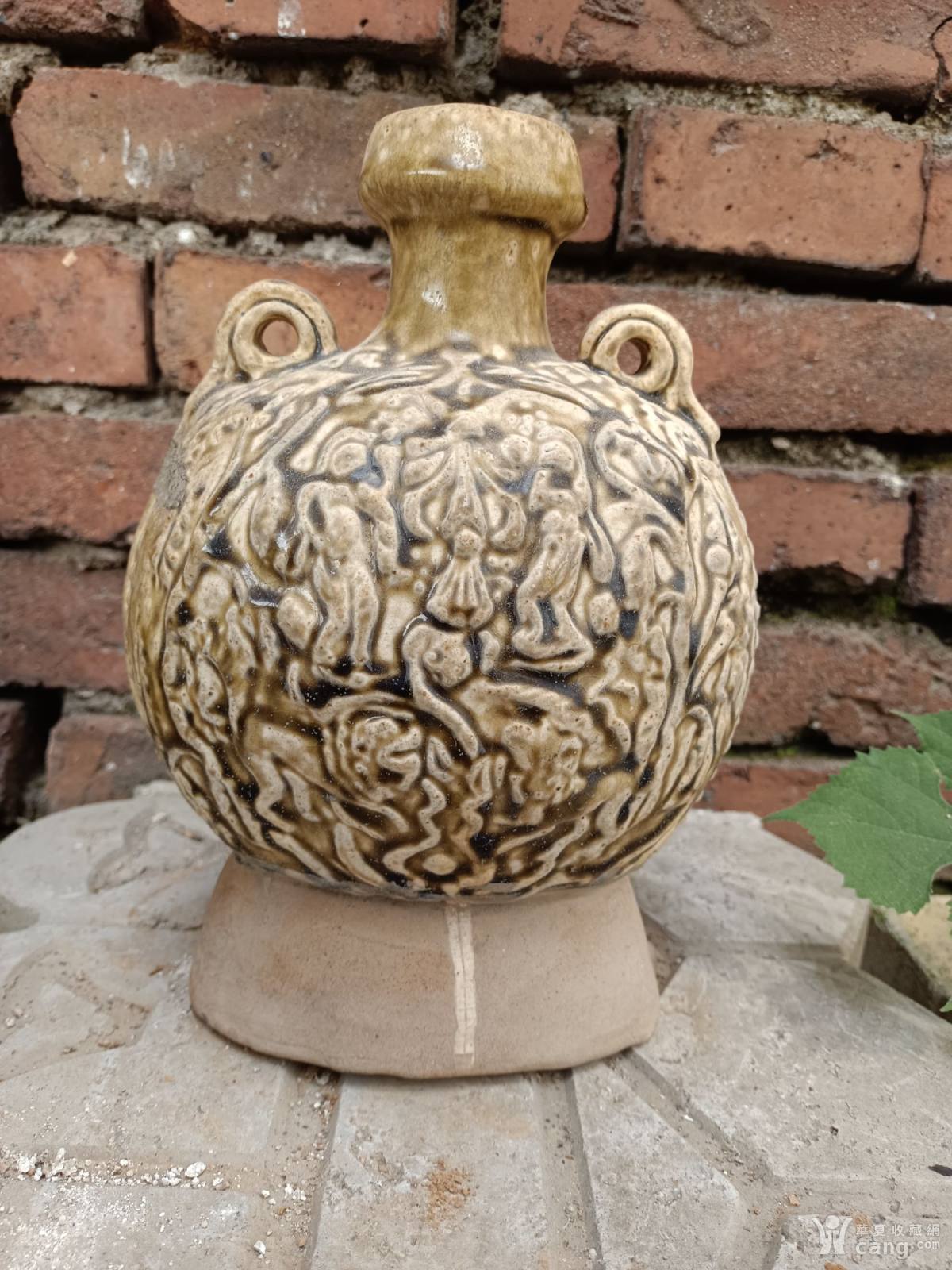 唐代邢窑瓷器,黄釉双系印花扁瓶