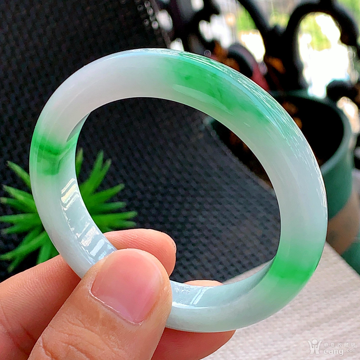 缅甸天然翡翠A货冰透水润飘阳绿宽边手镯53.5圈口