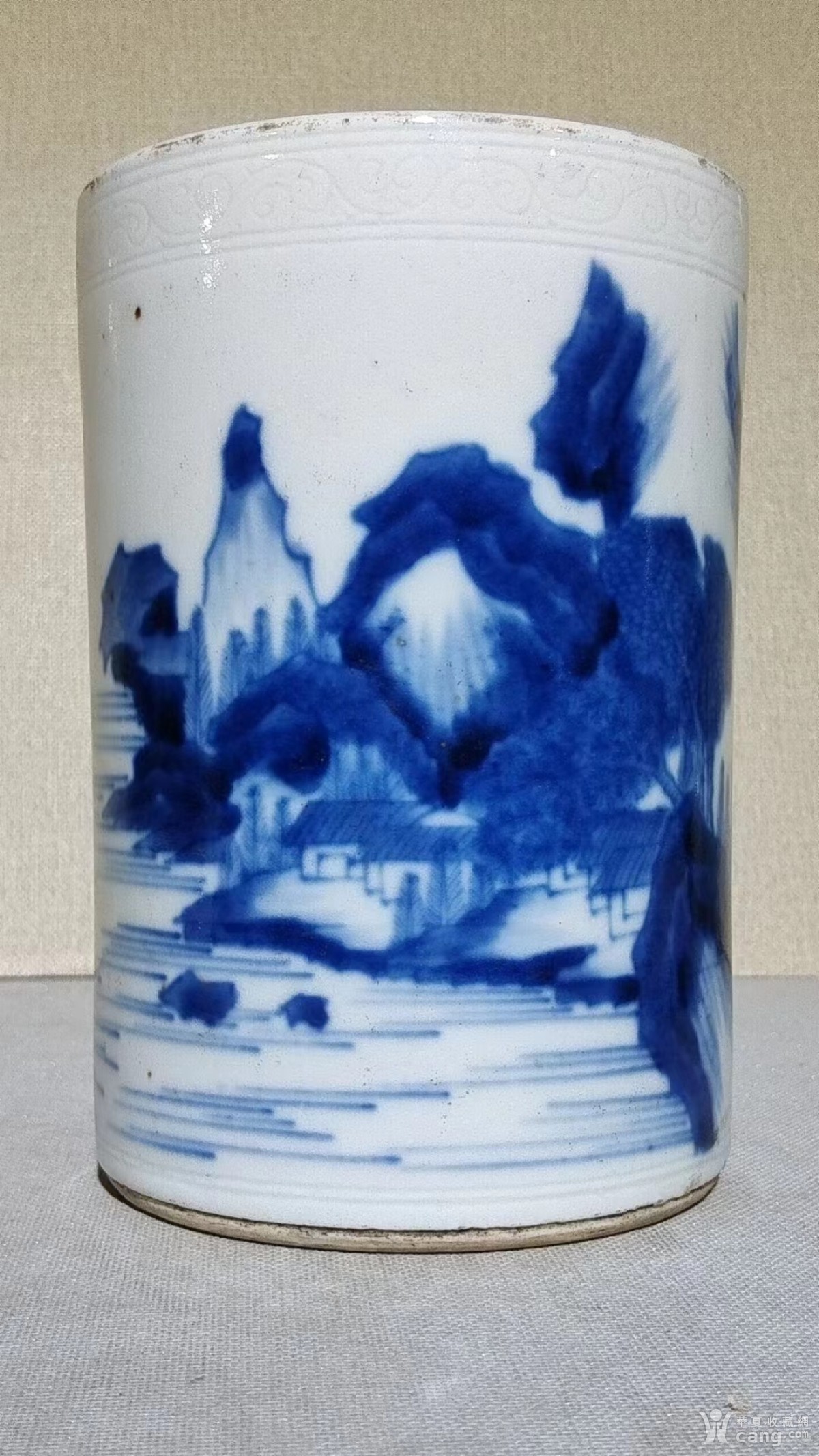 青花山水人物笔筒