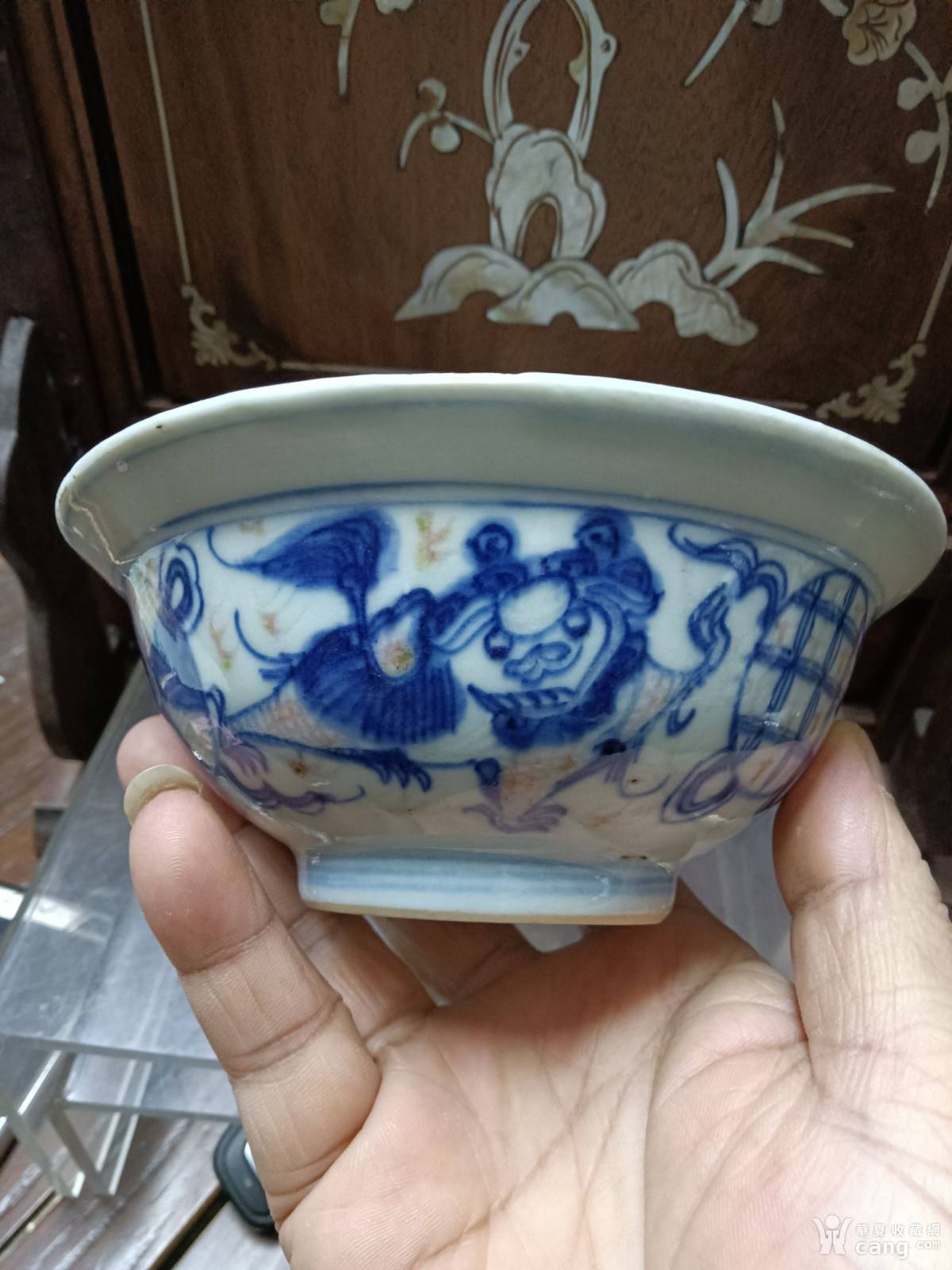 清嘉庆青花釉里红狮子绣球纹折沿碗