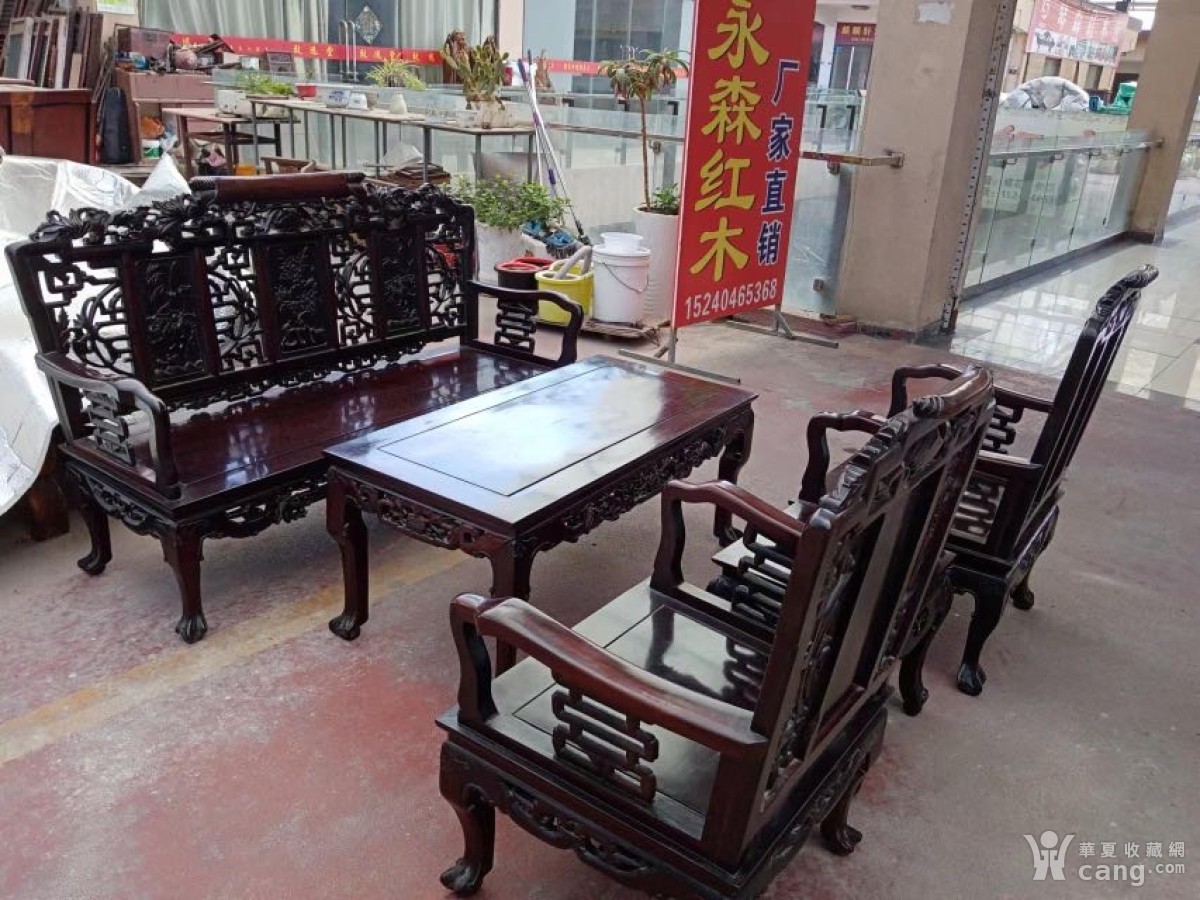 九十年代苏工精雕大红酸枝沙发五件套,酸枝三人茶几尺寸110*