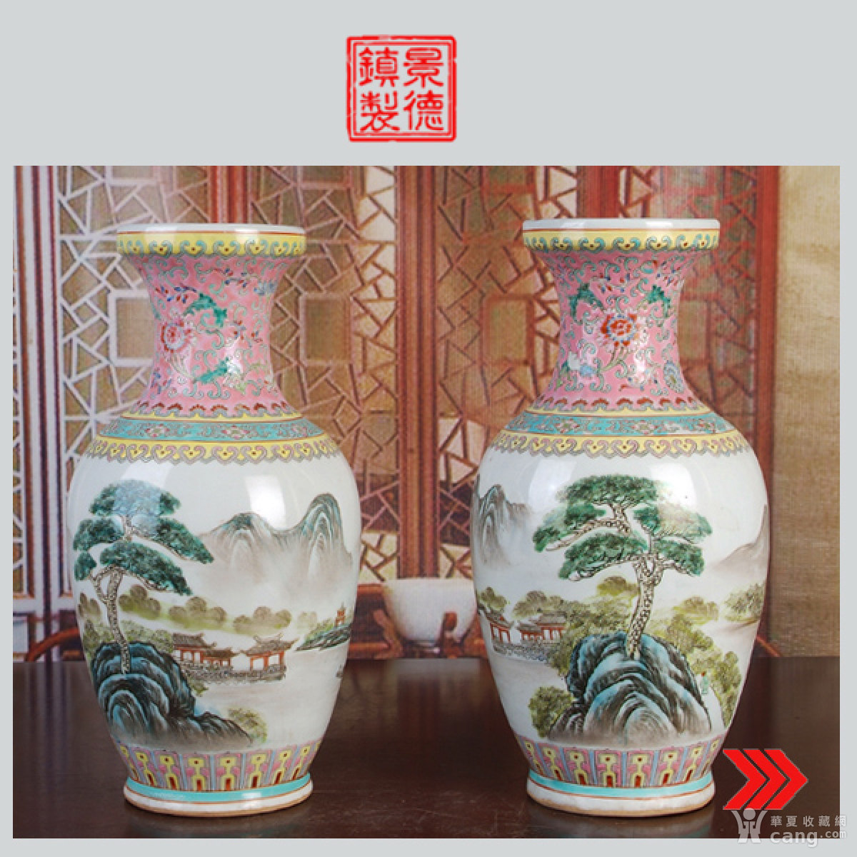 厂货手工彩绘山水风景西莲边角花篮瓶一对