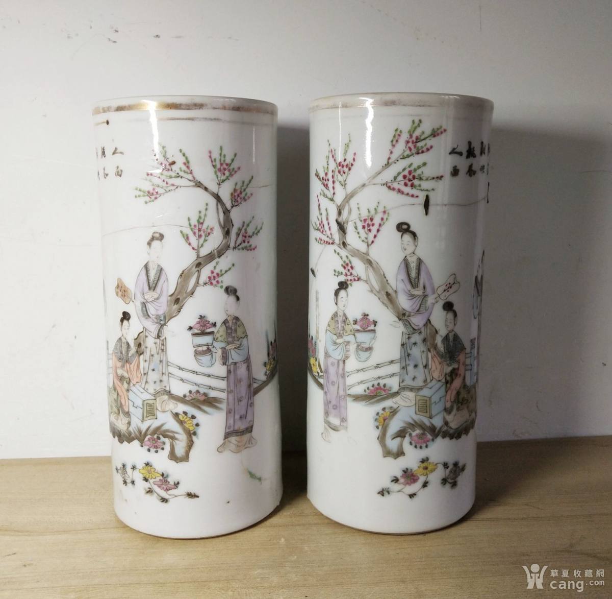 一对民国粉彩仕女帽筒