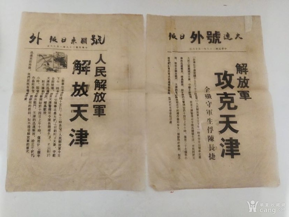 民国时期老油印纸号外两份,一份解放军攻克天津的,一份解放天津