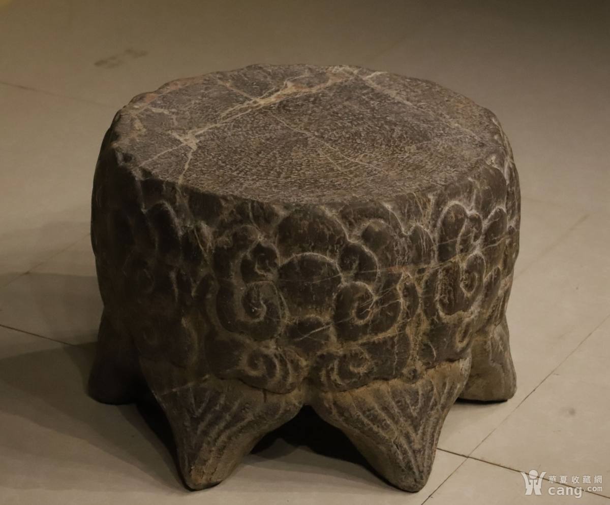 云纹石座 此座一石整雕,圆润饱满,周身浮雕云纹,线条流