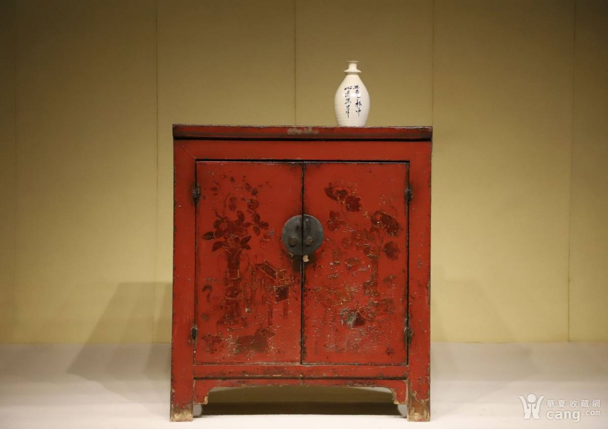朱漆描金彩绘书柜 此柜器型规整典雅,底部披灰,正面朱红