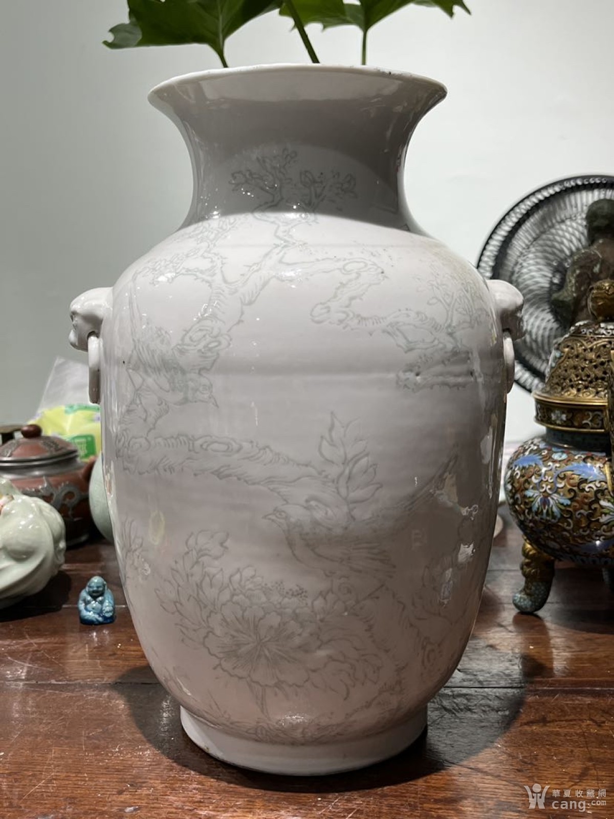清代大清光绪年制雕刻瓷「恩爱图」单色青釉瑞兽耳挂环耳赏器