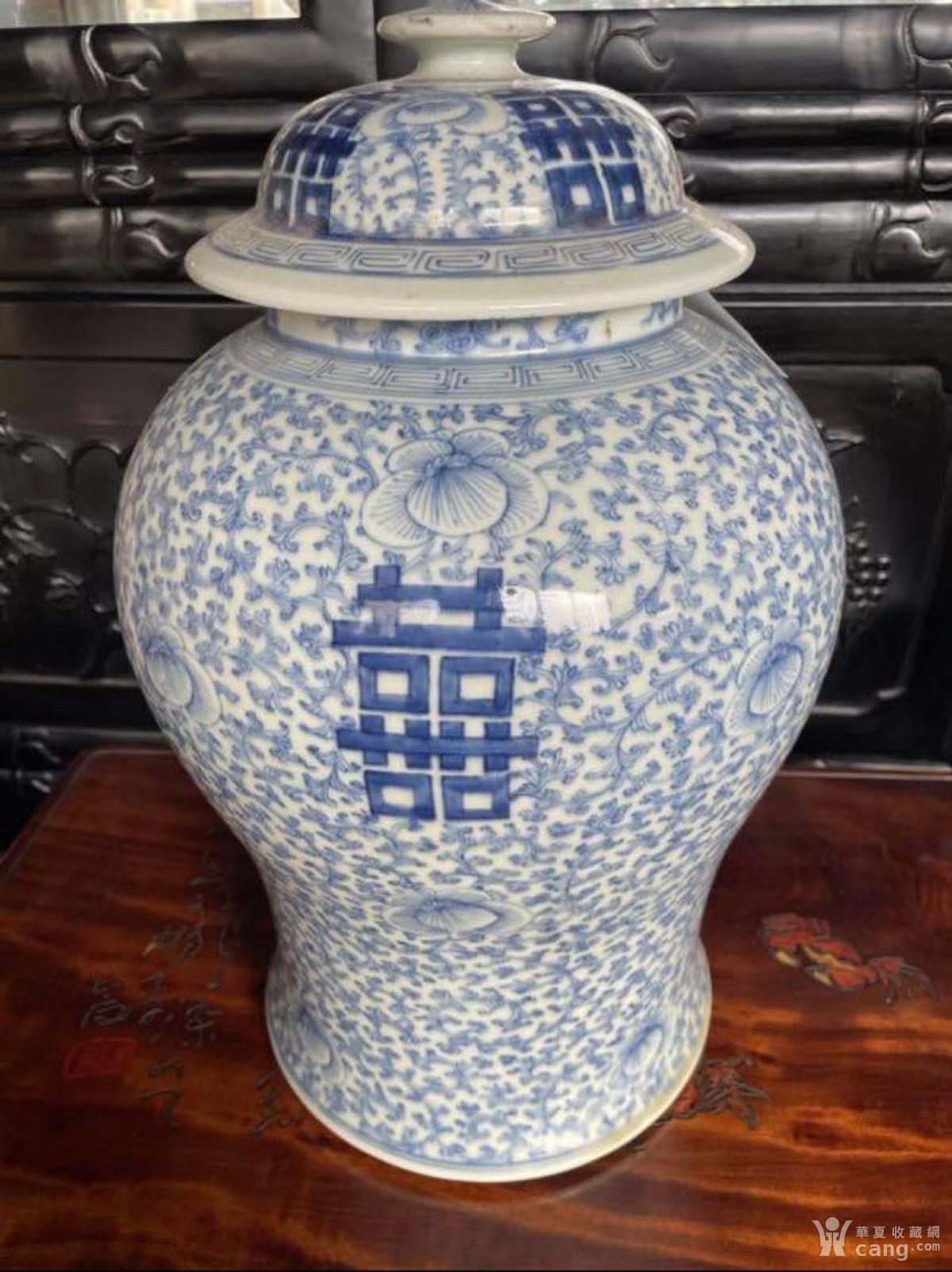 清 嘉庆 青花大叶缠枝莲小喜字将军罐