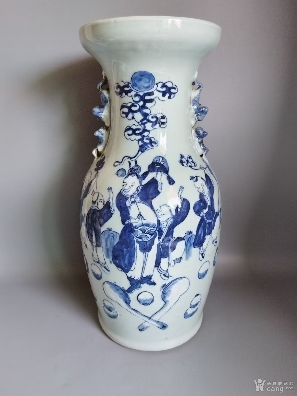 清中豆青釉青花加白五子夺魁人物瓶