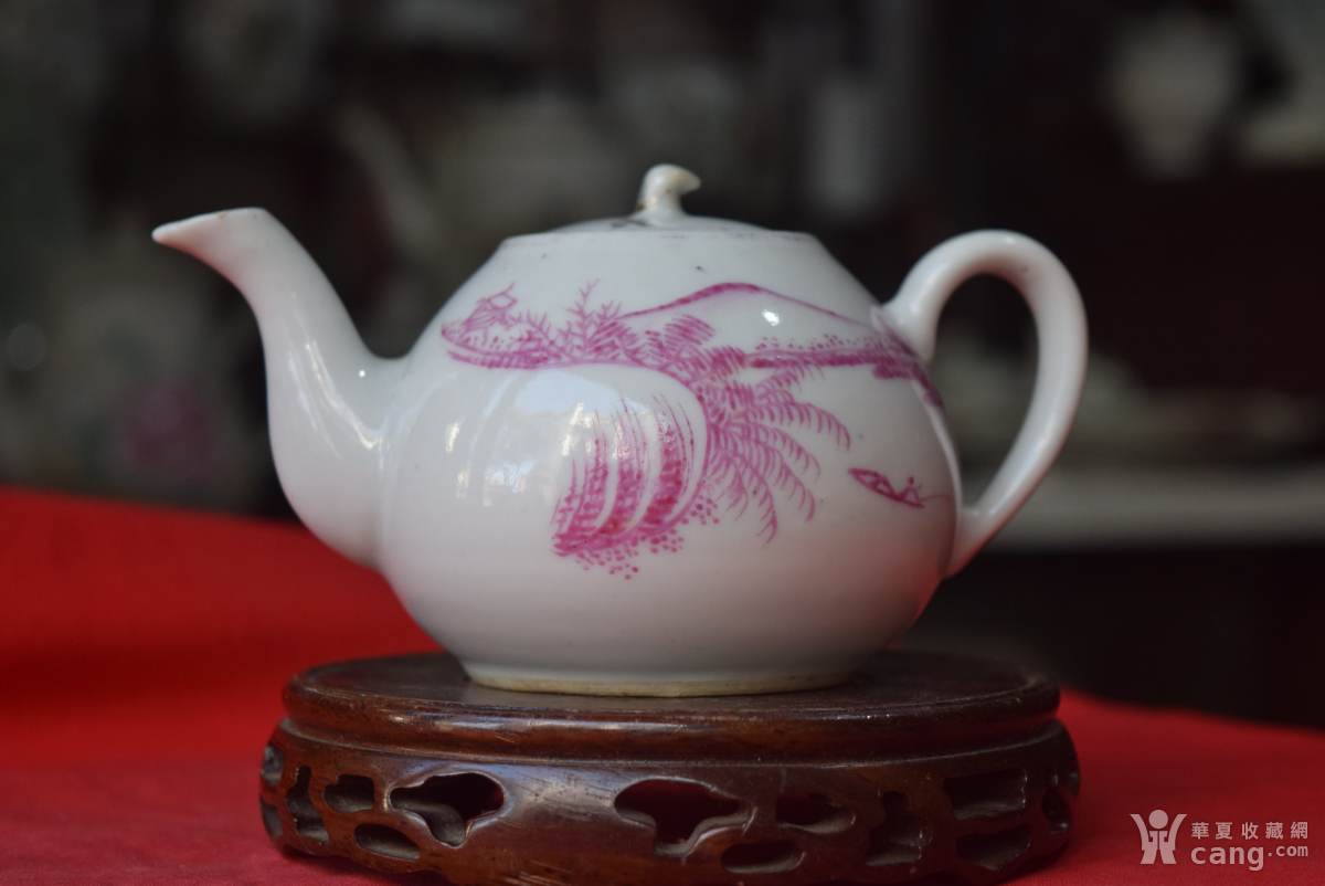 民国粉彩胭脂红山水人物纹一把抓执壶(包老)