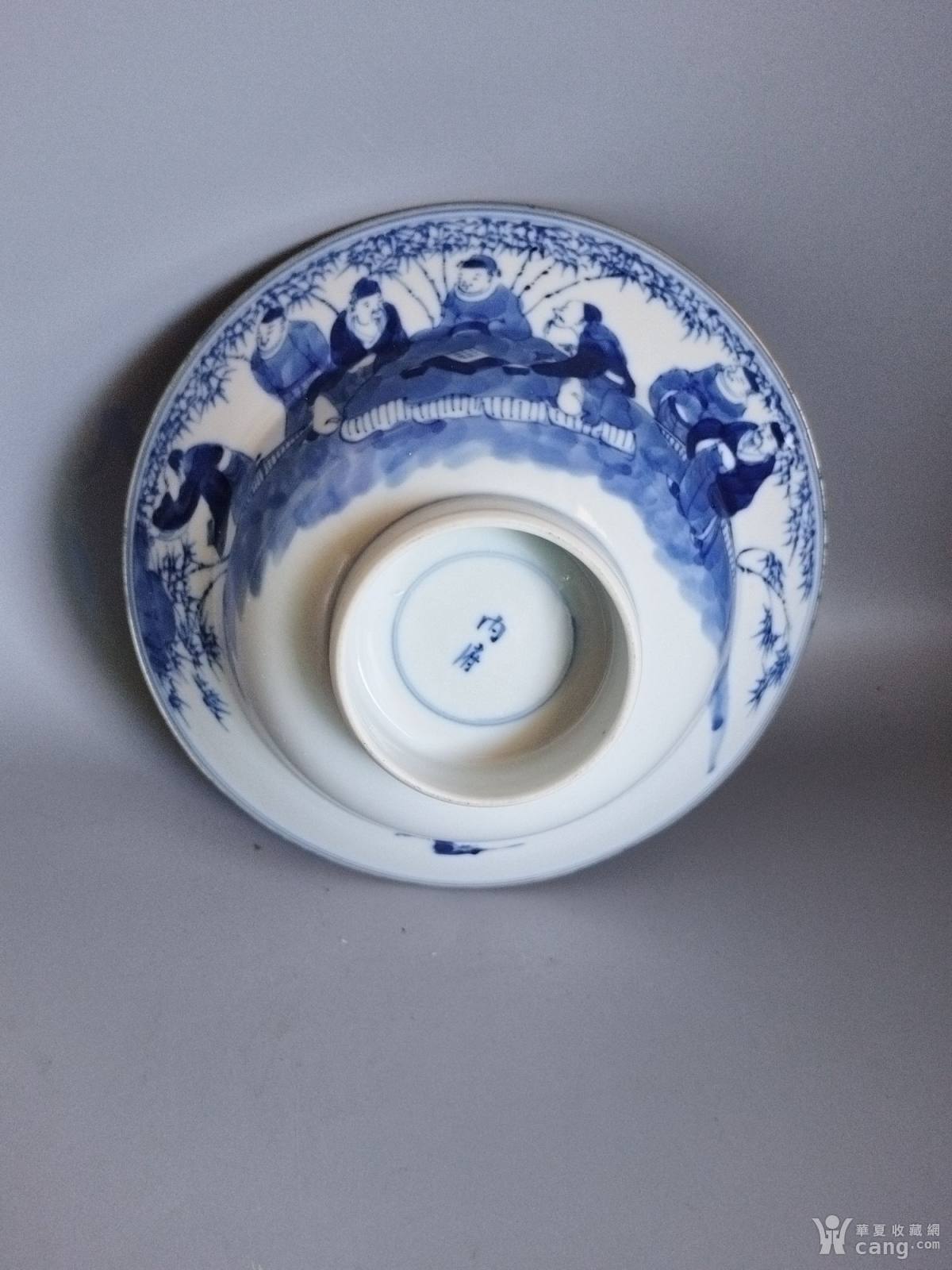 清代内青花花卉五福捧寿外青花竹林七贤人物斗笠碗