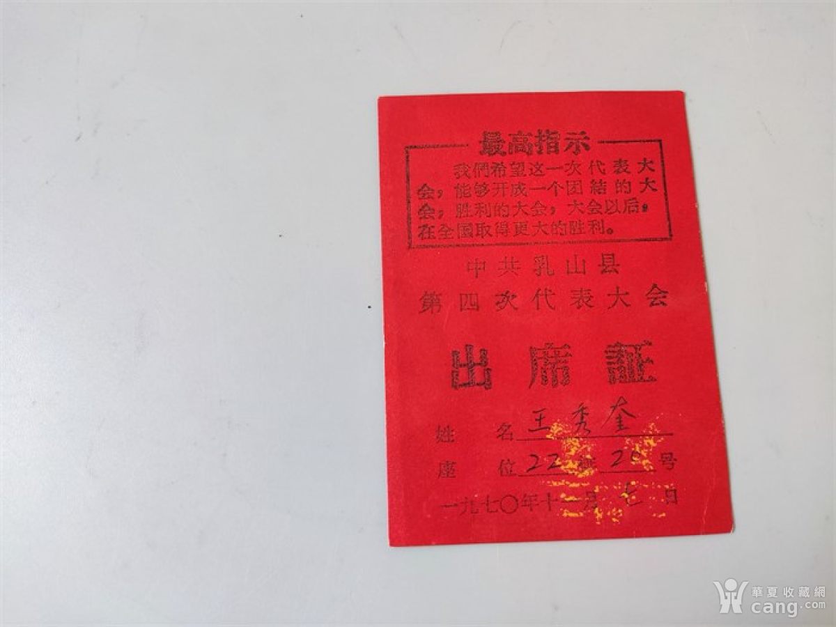 1970年带毛主席语录的山东乳山县第四次代表大会出席证