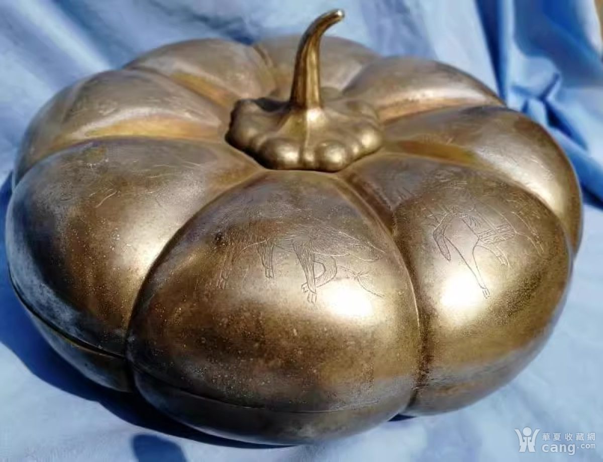 清代铜镀银雕八仙人物瓜型盖盒完好直径30.5公分