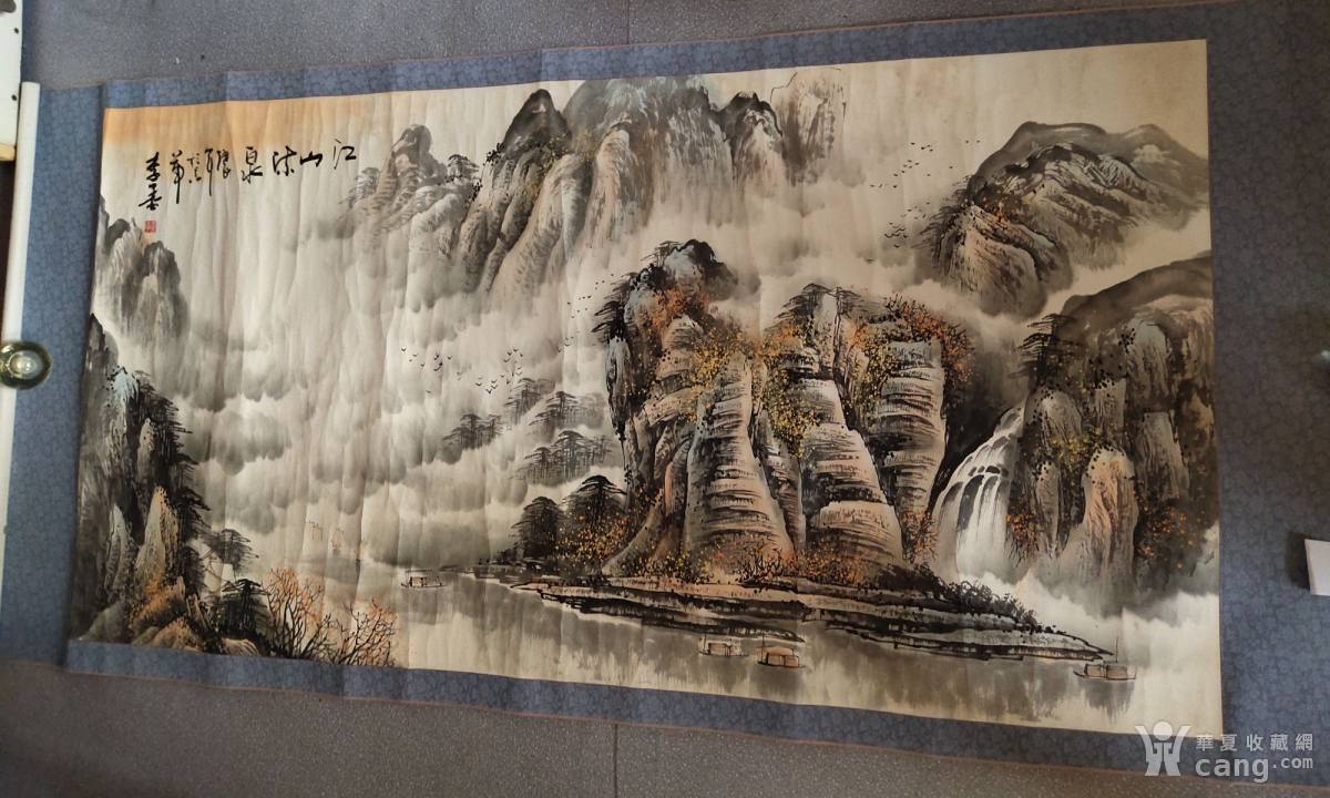 著名画家李墨六尺整张彩绘山水横幅一幅,165*68CM。李墨