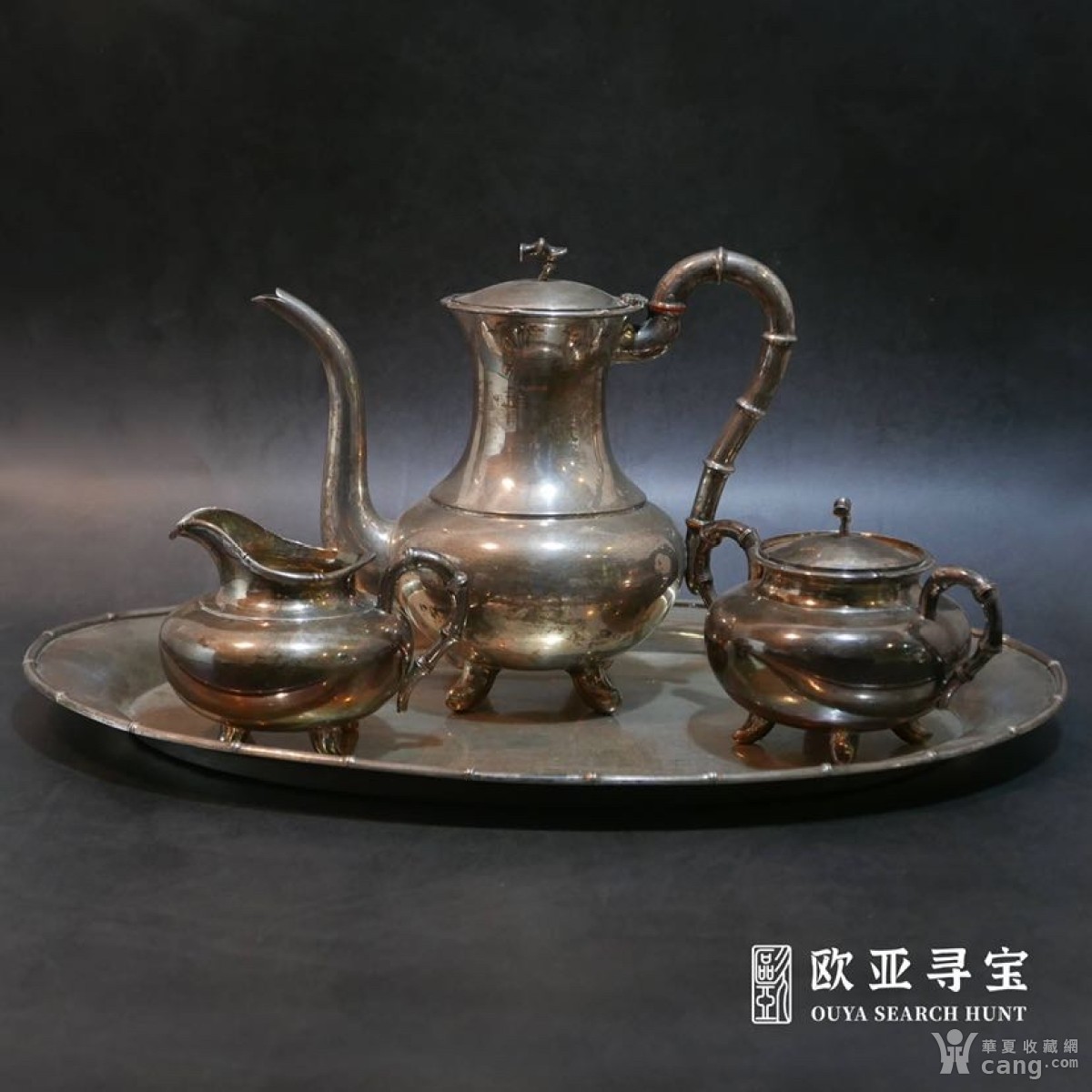 清代经典昆和款竹节把素面银茶具一套