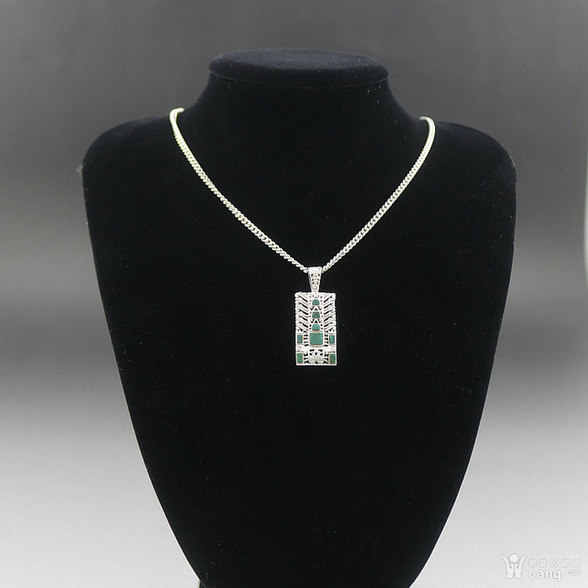 【西洋古董银器/首饰】意大利镂空镶嵌绿石纯银方形吊坠项链