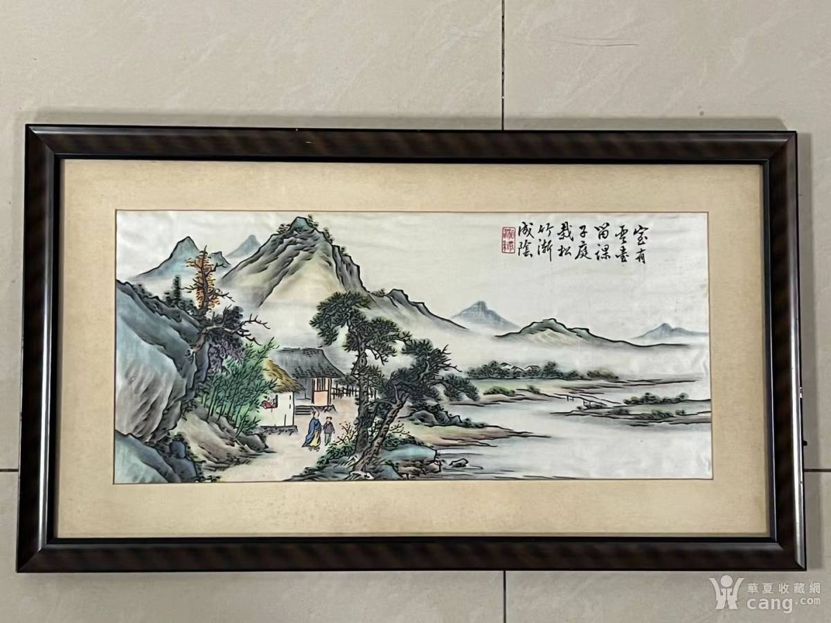 解放初期湘绣山水人家绣片挂屏