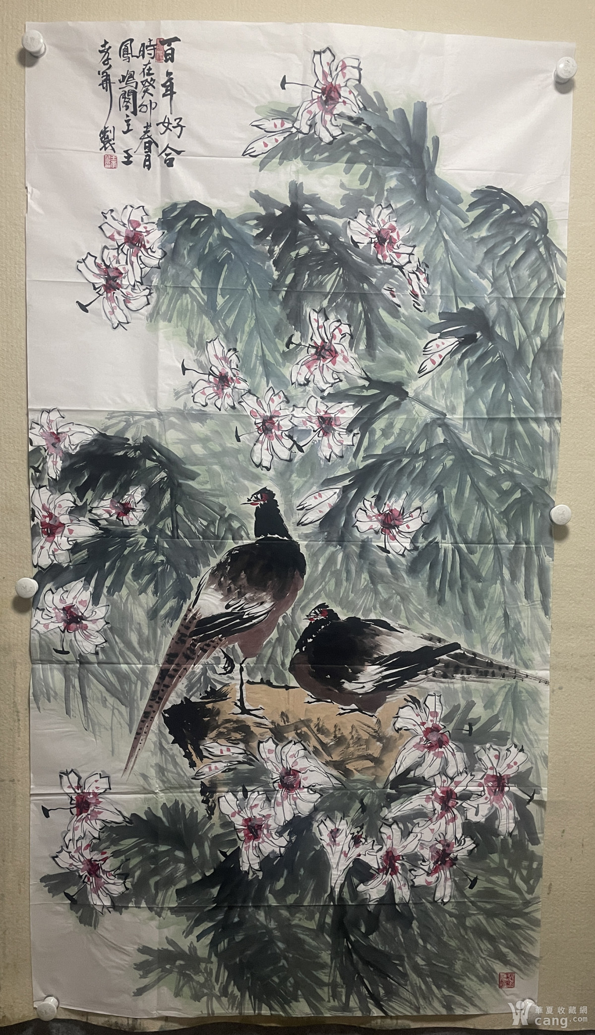 六尺整张【保真】王孝华6尺中堂花鸟画百合花锦鸡6《百年好合》