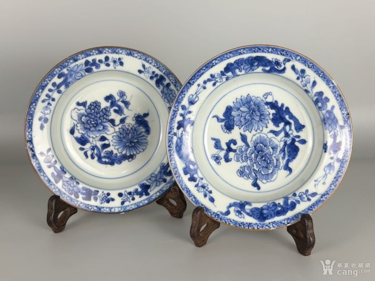 康熙青花富贵牡丹纹深腹折沿盘一对