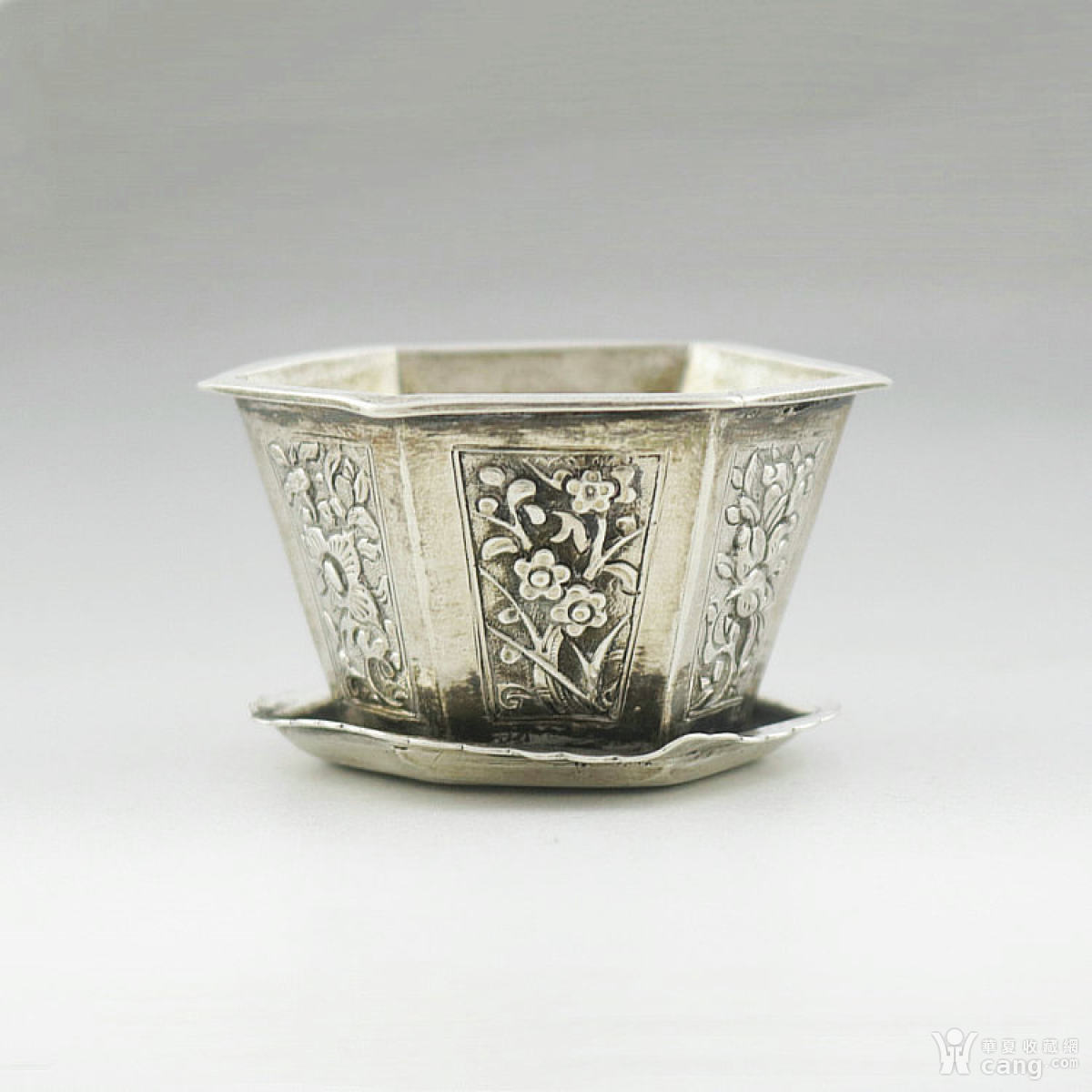 【海外回流】清末梅菊宝相花浮雕六角花盆造型纯银摆件 特