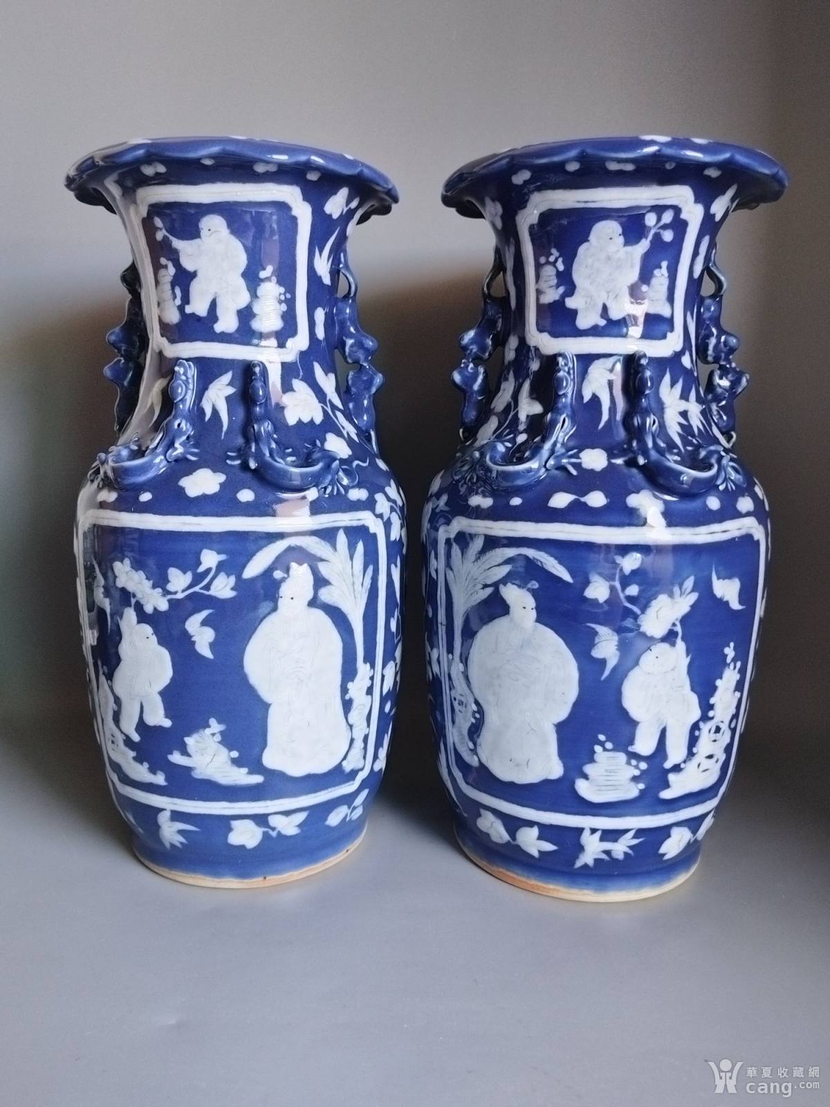 清中蓝釉加白开窗 四爱图陶渊明爱菊 苏东坡爱砚人物瓶一对