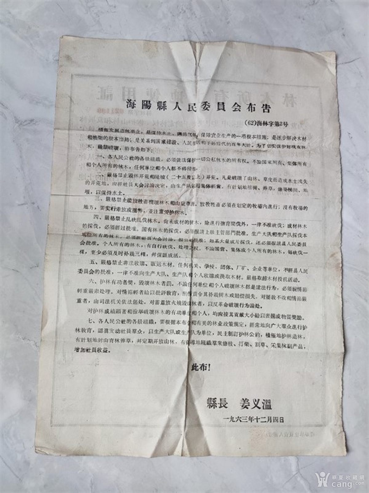 64年山东海阳县林木所有土地使用证及县长签发的布告