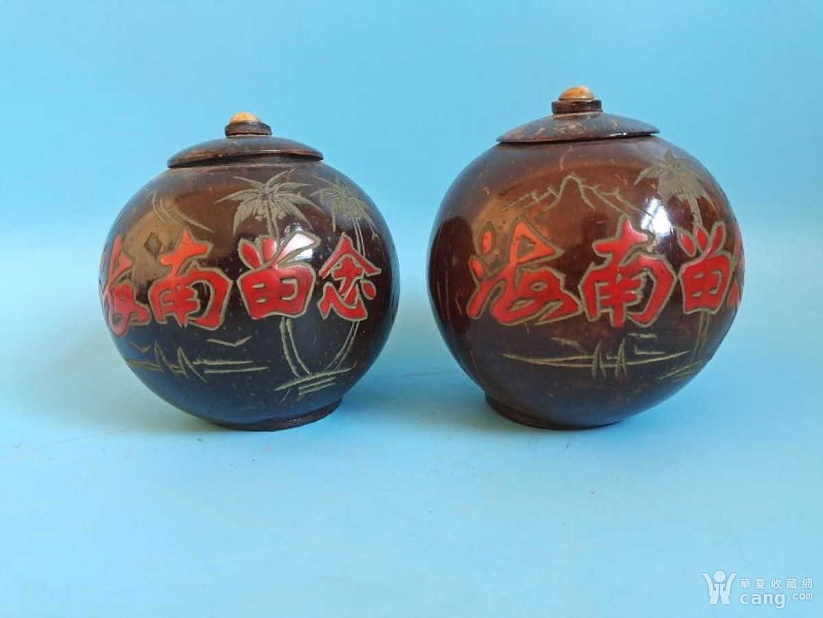 60/70年代海南椰子壳做茶叶罐两个,纯手工雕刻《海南留念