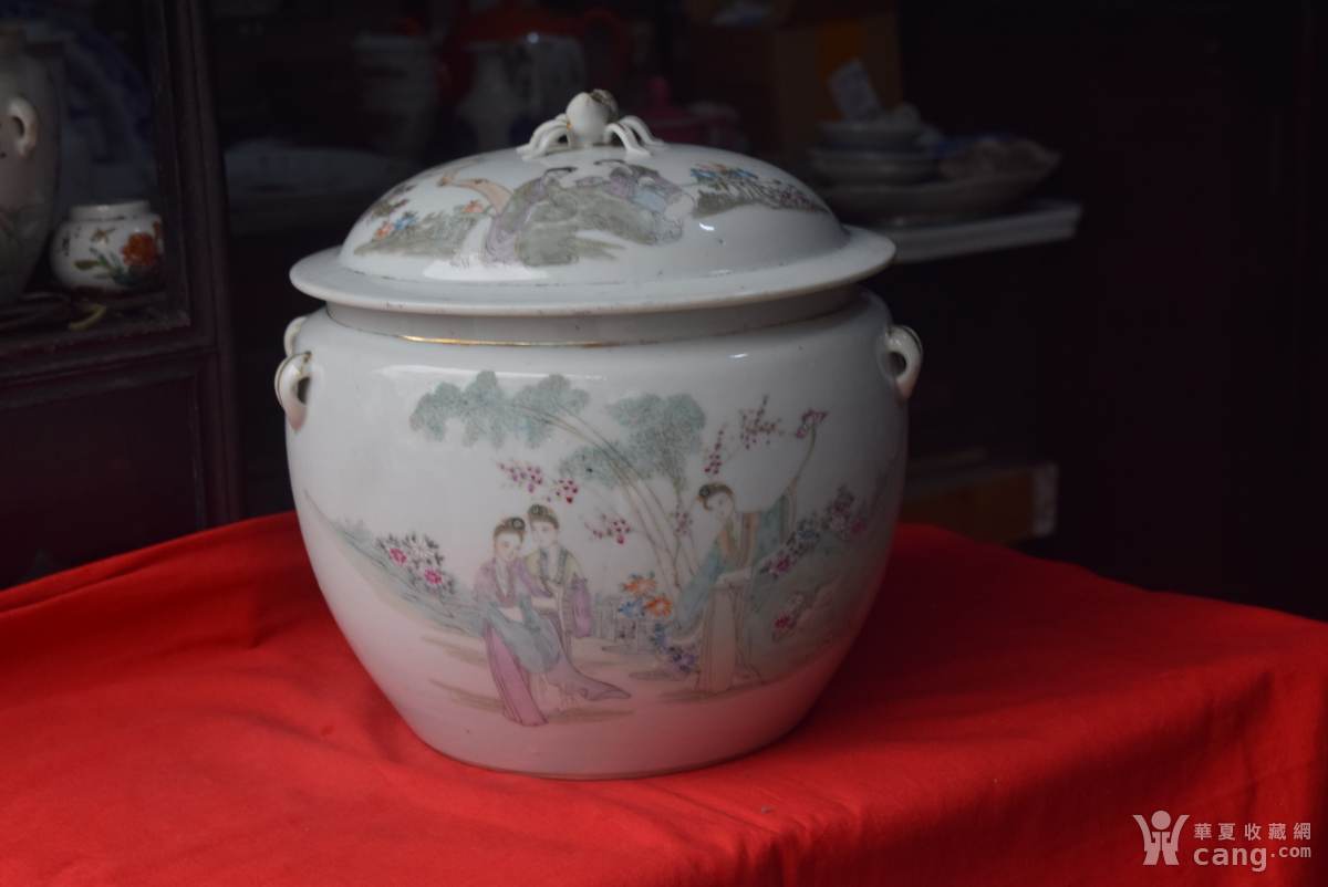 民国粉彩双面绘仕女人物纹大号粥罐(包老)