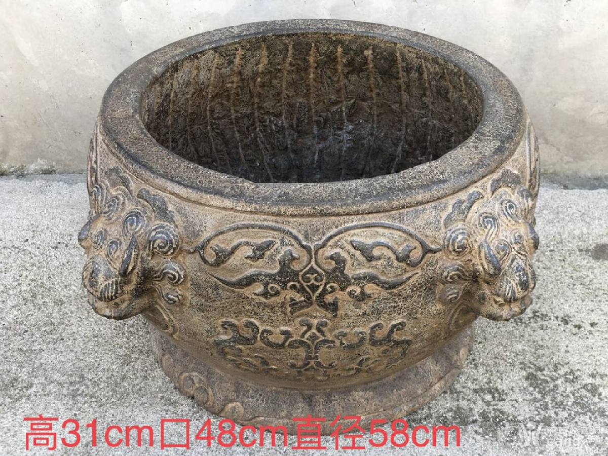 天津拆迁偶得青石养鱼盆,浮雕四兽首挂耳图案,满身浮雕瑞兽麒麟