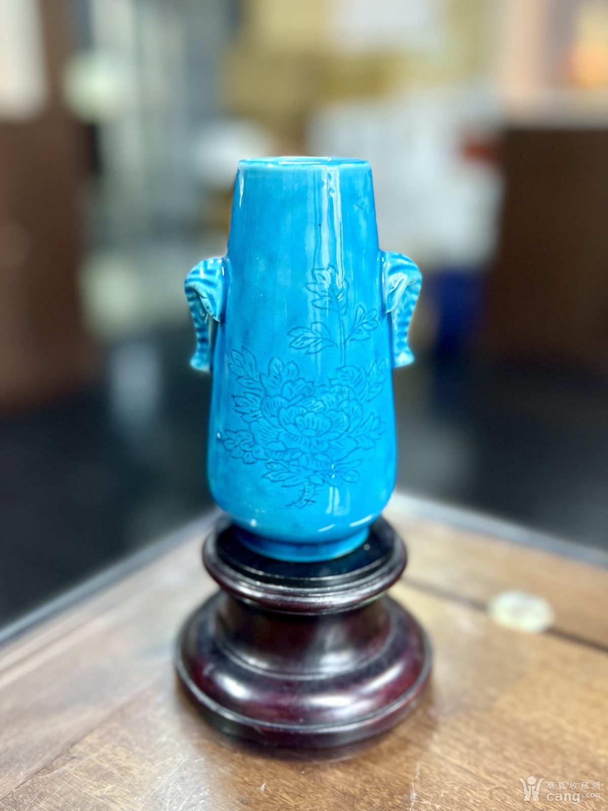 清代精品孔雀蓝釉暗刻牡丹花卉纹象耳玉米尊