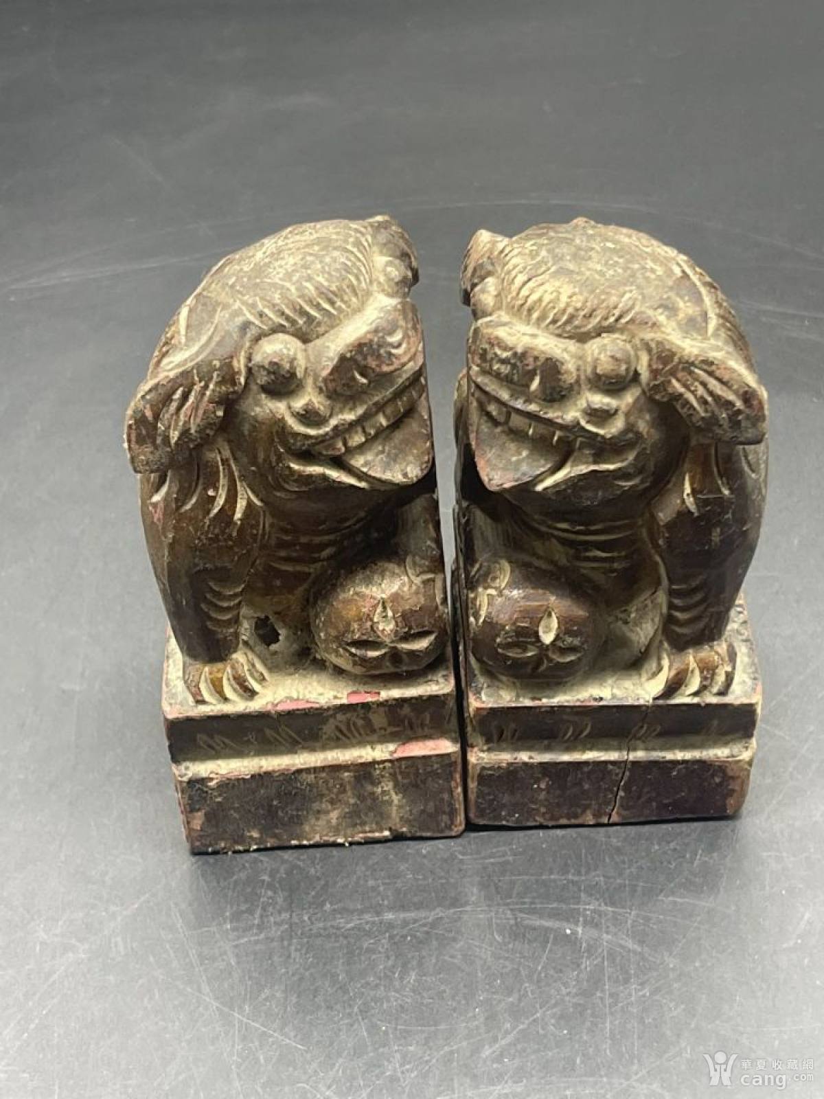 一对清代樟木手刻狮子摆件,纯手工雕刻,刻画清晰,包浆温润自然