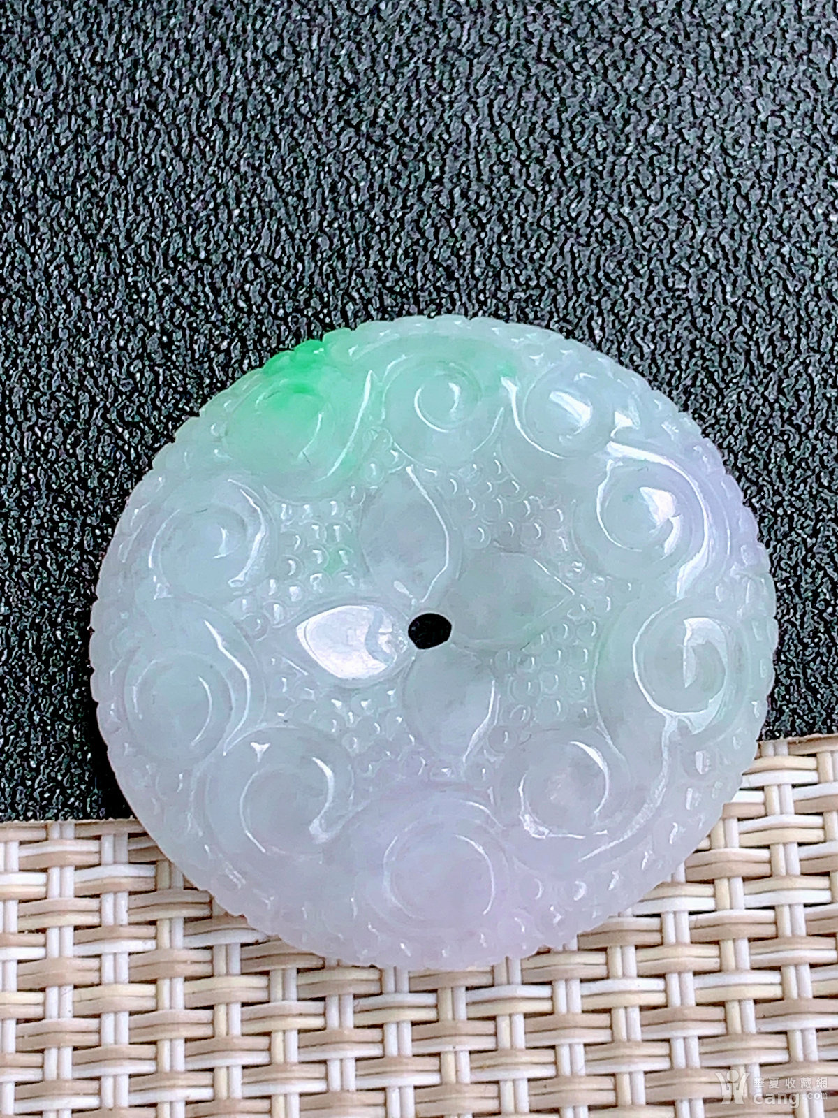 缅甸天然翡翠A货冰透飘花复古花雕平安扣