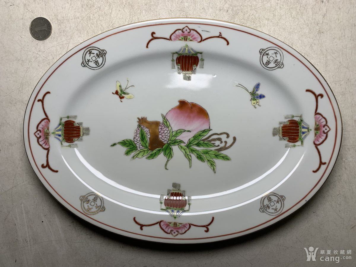 少见题材七十年代粉彩寿桃灯笼描金大吉大利赏盘