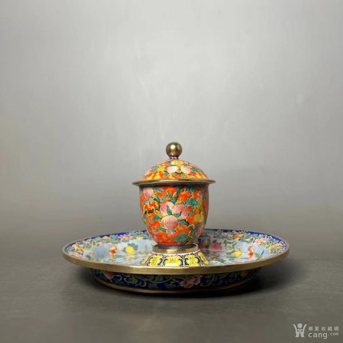 清乾隆 铜胎画珐琅粉橘地福寿万代盏杯盘