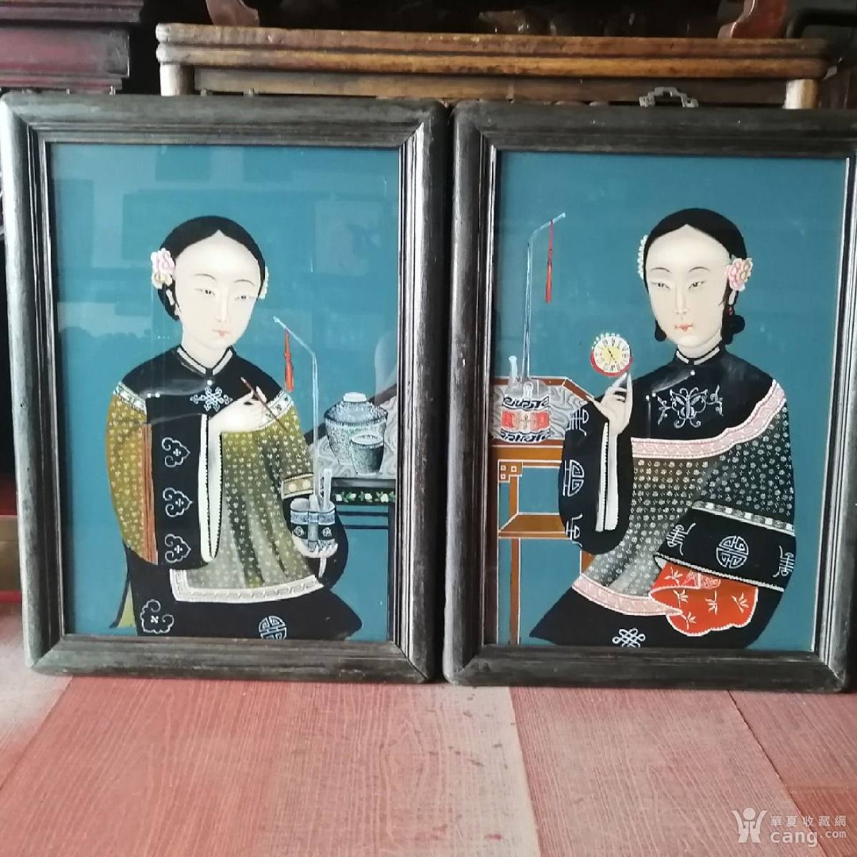 清代美人玻璃画一对