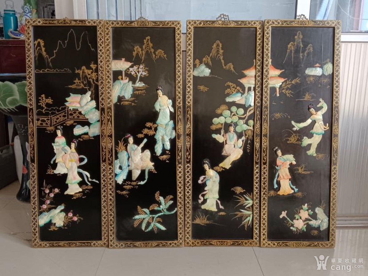 六七十年代大漆镶嵌彩贝人物四扇屏一套,纯手工制作,工艺精美,