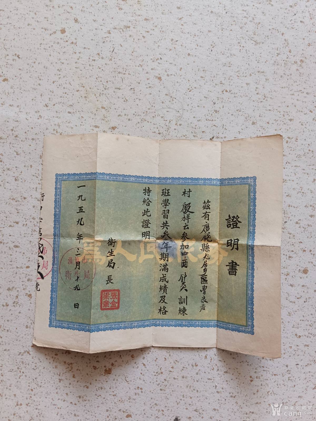 59年的针灸学业证明书