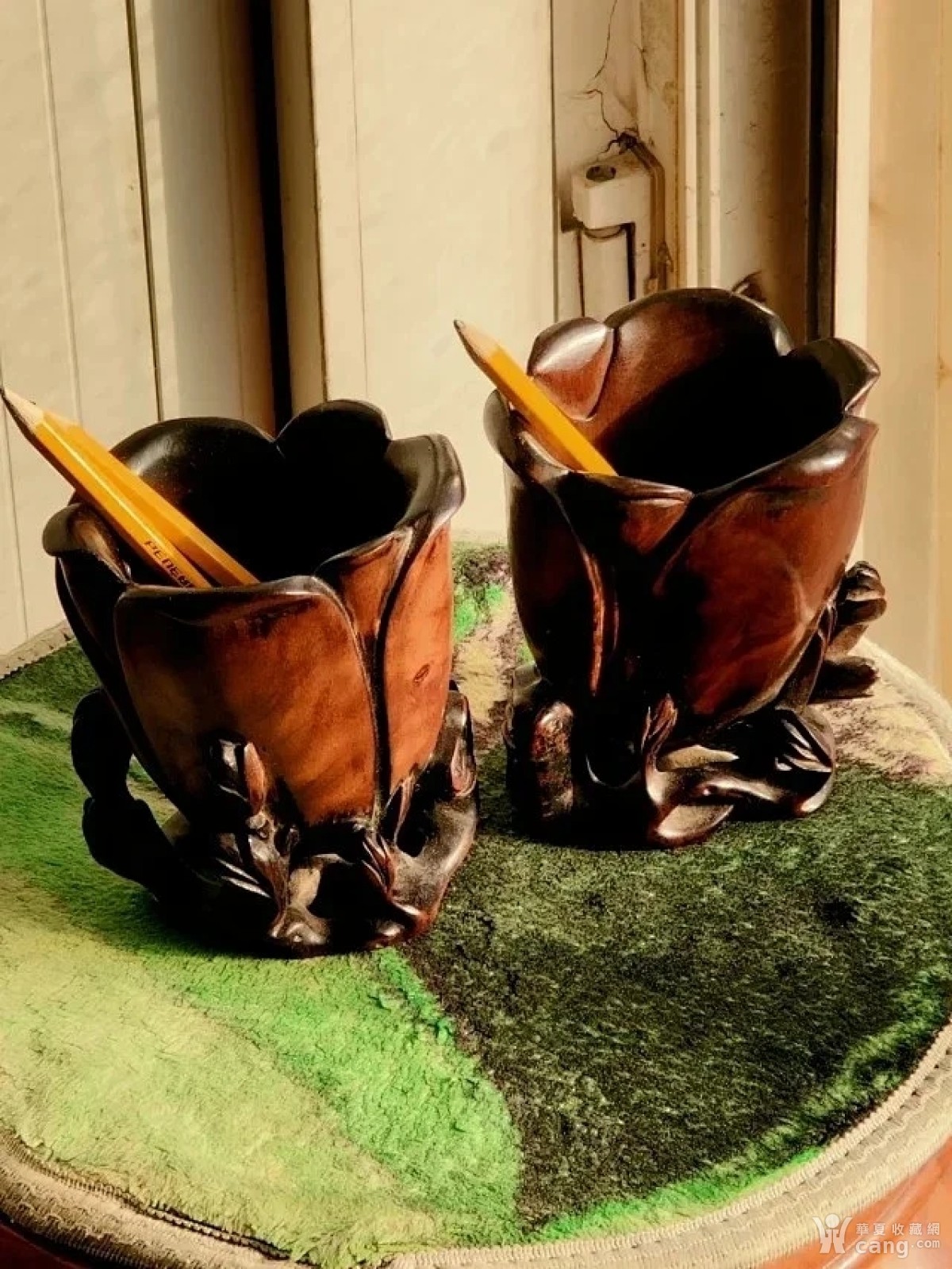 450号,清代老黄花梨,透雕刻花笔筒一对,尺寸13-10厘米