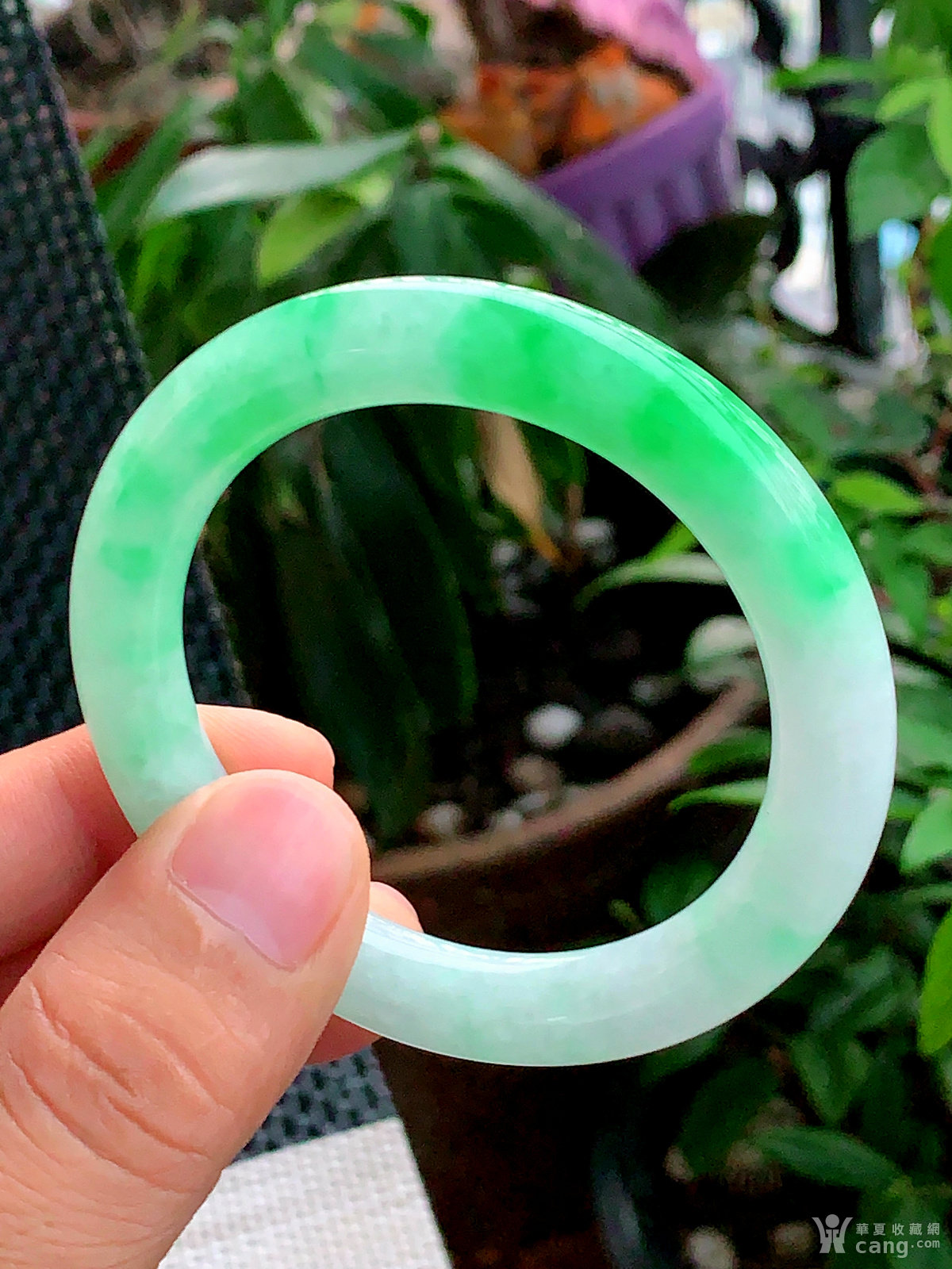 缅甸天然翡翠A货冰透水润飘阳绿圆条手镯55.2圈口