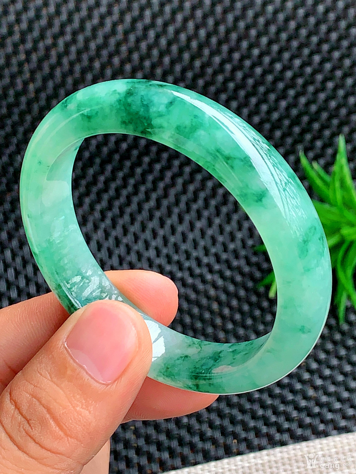 缅甸天然翡翠A货冰透水润飘花宽边手镯56.5圈口