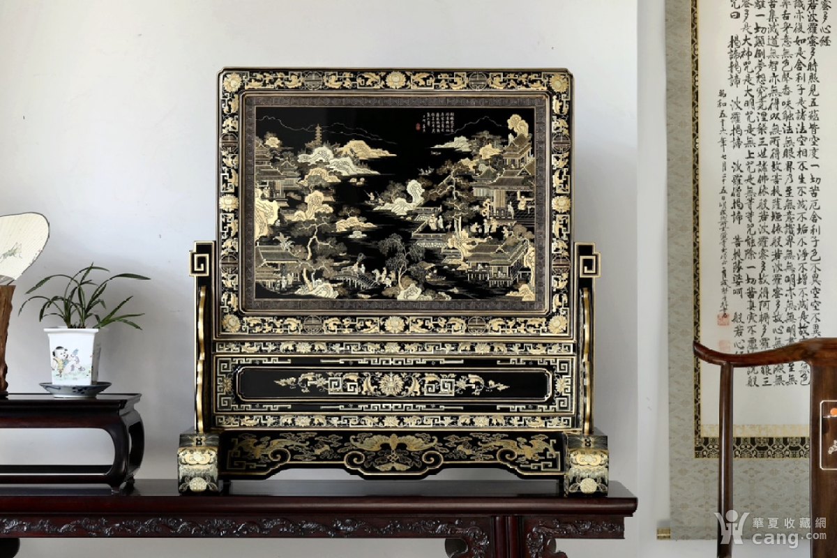 收藏级 木胎漆器描金山水人物故事图文房插屏