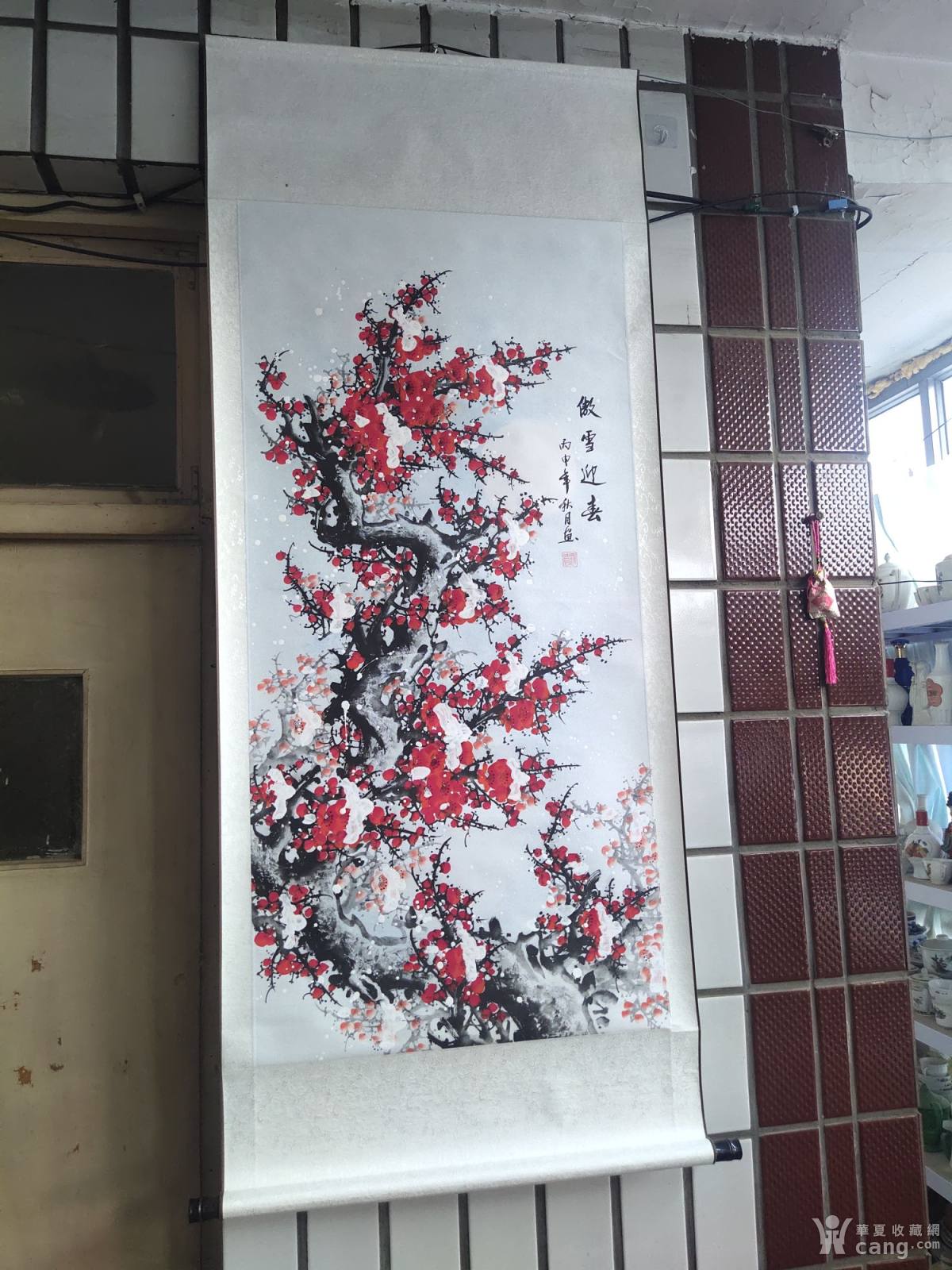 漂亮半手绘傲雪迎春梅花中堂一幅。