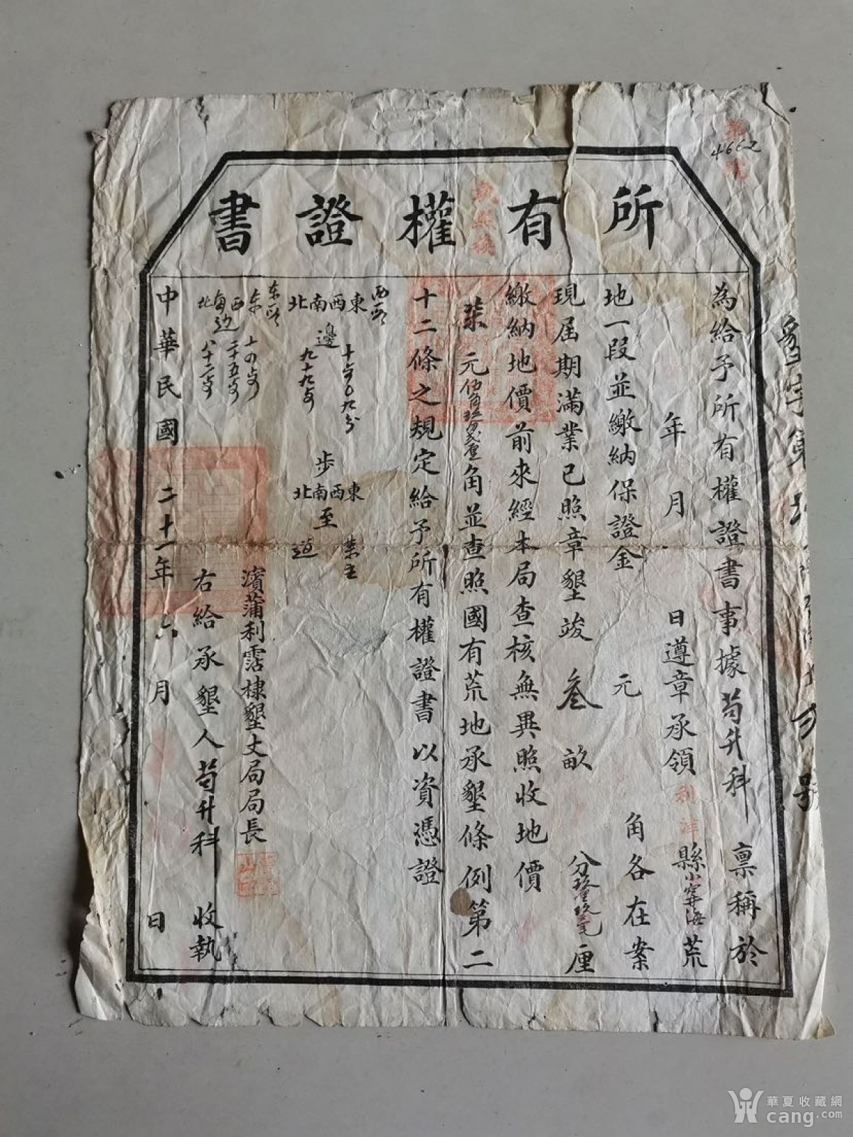 民国二十一年(所有权证书)1张。开耕荒地,缴税后发给有权人的