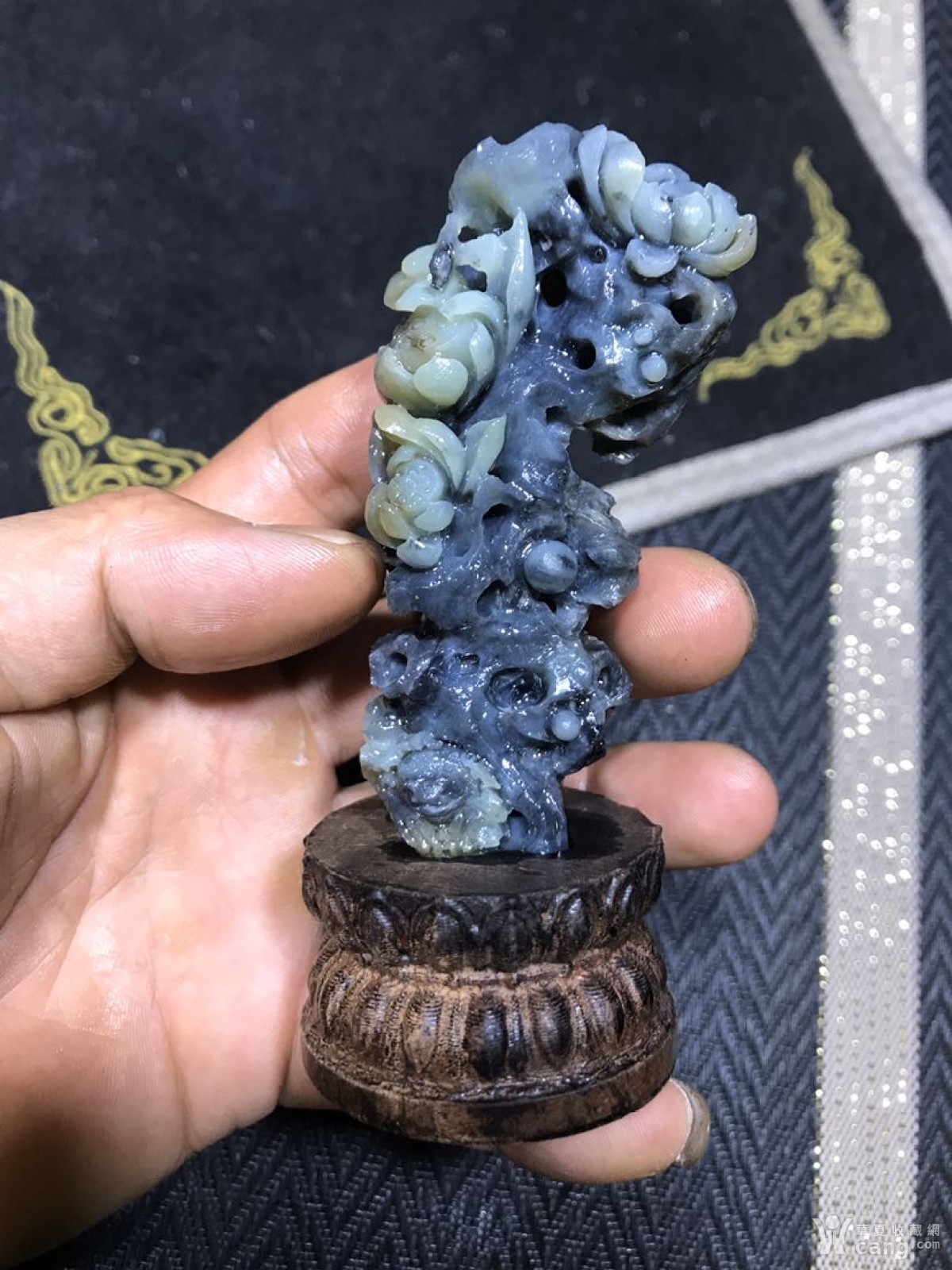 新疆和田玉青花料子巧雕太湖石,莲花哇哇来财,80克