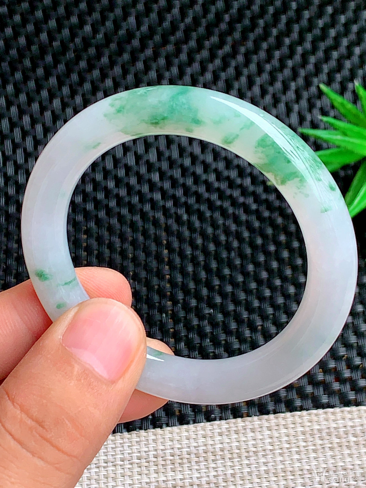 缅甸天然翡翠A货冰透水润飘花圆条手镯57.8圈口