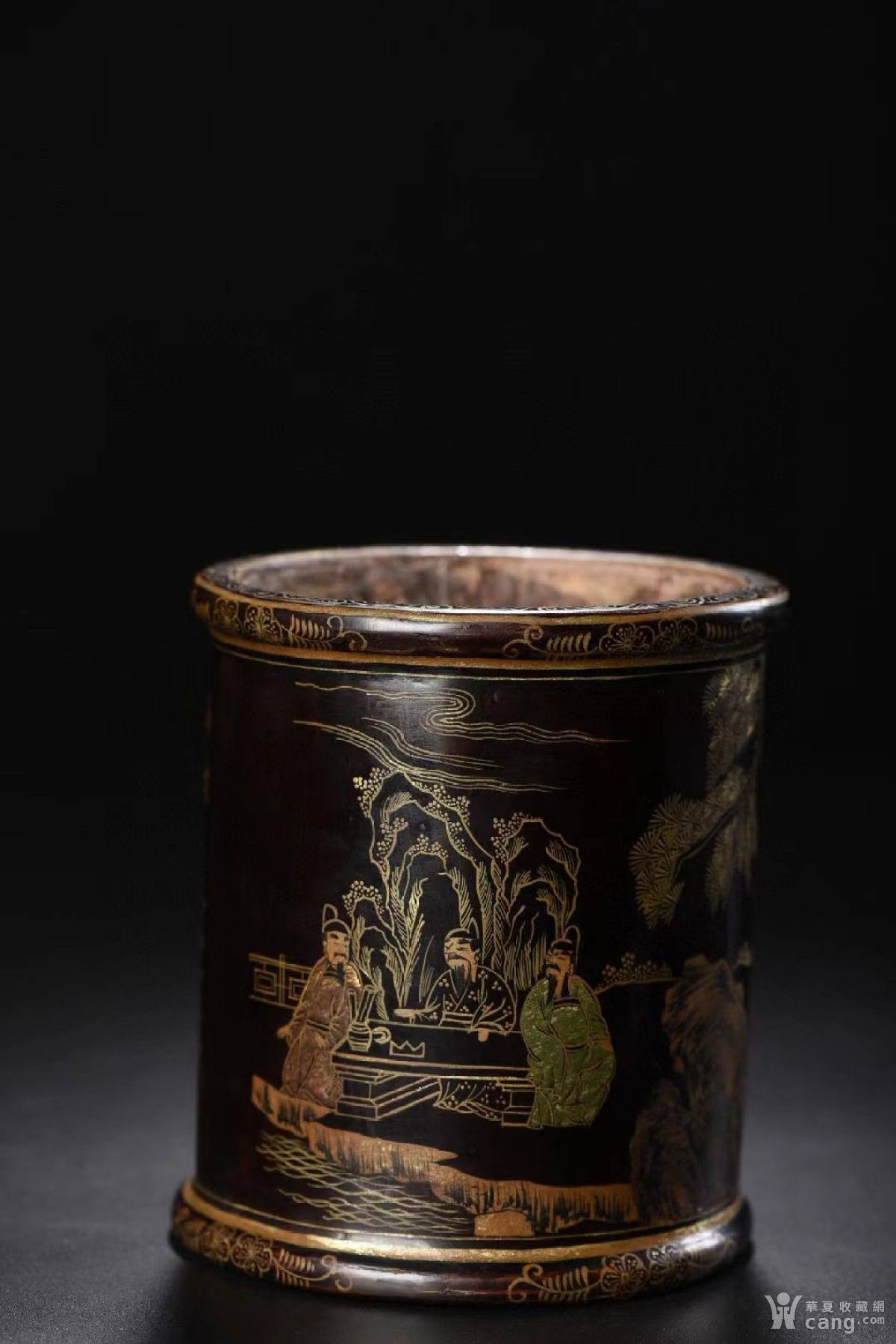 老纸胎描真金漆器人物故事题诗笔筒 高11cm 直径9